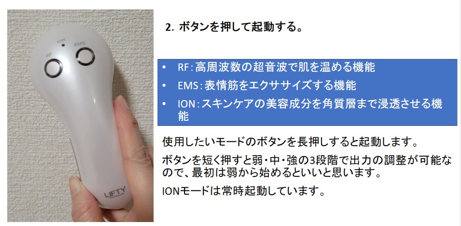 - 肌を温めてやわらげるRFと表情筋を刺激するEMS 、美容成分を角質層まで届けるIONの3つの機能で表情筋にしっかりアプローチできる。