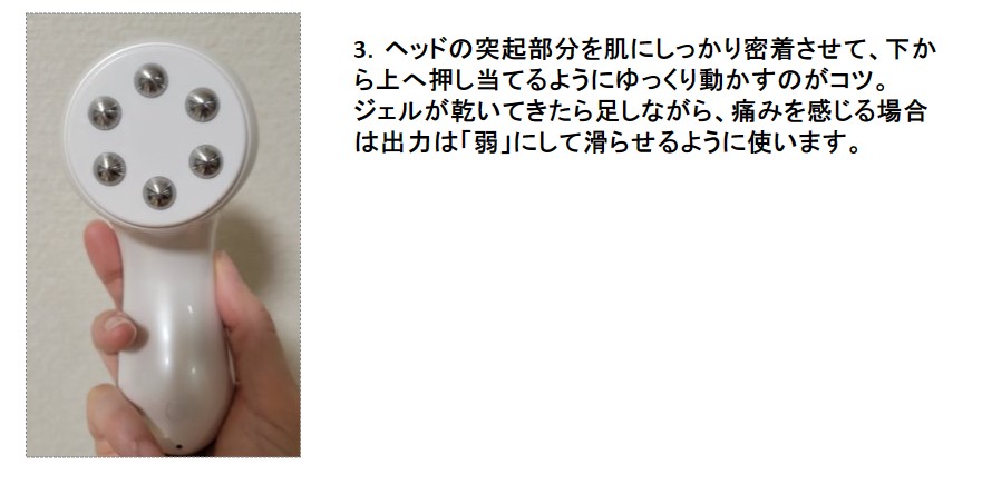 - 電流を流す際、ピリピリとした痛みを感じるので、痛みに弱い方や、肌の弱い方にはあまりおすすめできない。